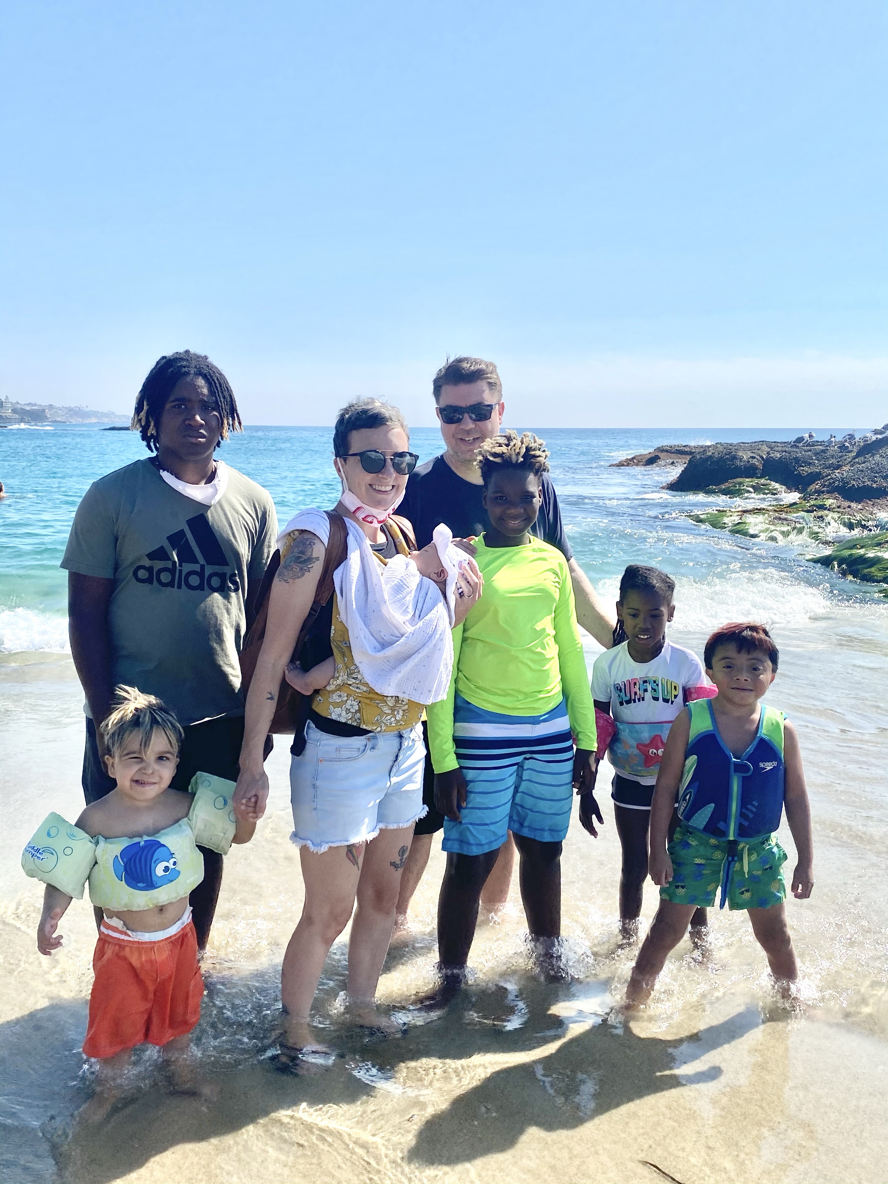 “We’re the Foxes. Sean and Chantel and our kids. We planned not to have biological kids when we got married and adopted our oldest, Colton (13) as a infant in 2007. He has always been an empath and old soul. After that we decided to become foster parents. We felt drawn to kids with special placement needs. We didn’t feel afraid of things like diagnoses or medical equipment so it seemed like the right fit. We were blessed with Ty (11), a brave sweet magical 4 year old at the time, in 2013. As we were finalizing Ty’s adoption we decided to open back up and wanted an older girl. We got called for Phoenix (6) instead. He is sensitive and spiritually in tune. After Phoenix got a little older and healthier we said “we want that girl!” So we said yes to Rosie. She became our angel at 8 months old after fighting a hard battle on earth. We feel like she brought us her sister Mia (7) to let us see what life with her could have looked like since they share similar stories. Mia is the bravest and most accepting kid I know. She came to us at 3 years old and has matured so much so fast we sometimes can’t keep up! Mia’s social worker had another kid in mind for us after watching our wild house during Mia’s case so we met Aramis (4) at 1.5 in the hospital where he’d lived most of his life and knew we wanted to bring him home. He epitomizes tenacity and determination and is like a grown man in a tiny body! We thought 5 kids was a lot of kids and we’d never have more…and we were so busy with sports and dance and school but then we were slowed way down by a pandemic…when a friend of mine who works in private adoption called me about a baby she wanted to make sure was respected and honored in a world that isn’t always accepting. Now that our lives are slow and we’re all home together we were able to say yes again! To our newest baby River. The brightest spot in 2020 by far!”