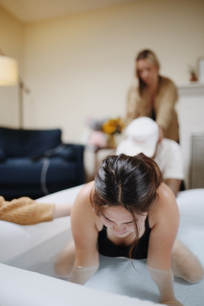 Nana and Papa came over to pick up Koa around 7:30am, Ryan and I left for a walk around the neighborhood, Brae arrived at 8:30, and our good friend Allie who had been staying with us for a few days left to catch her plane at 9. Contractions were strong but far apart still so Brae suggested we do some curb walking. They picked up while I moved but slowed down when I rested. I figured I was still in very early labor. At 10am my midwife Lindsey checked in with me since I had told her contractions had started earlier that morning. She asked if I wanted her to come by and I almost said no, not wanting to waste her time, but said sure instead. I was half expecting her to tell me I wasn’t dilated much so I could try to rest and take a nap. She arrived at 11:30am with an assistant who is also a midwife and her best friend, Ashlee. I had been hoping Ashlee would be at my birth! We casually chatted for a bit then she suggested she check my dilation. I laid down on the couch and after a few moments the biggest grin came over Lindsey’s face. She started laughing as she said, “You’re a 9!”. I was in complete shock! As was Brae and Ryan. The morning had been so casual and contractions pretty bearable. Lindsey asked me to push with the next contraction and said I was fully moving the baby. Everyone started going into action getting warm water in the birth pool, getting supplies ready, and Brae and I staring at each other with wide eyes and laughing at how I was somehow at a 9.